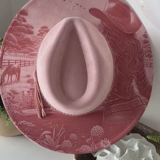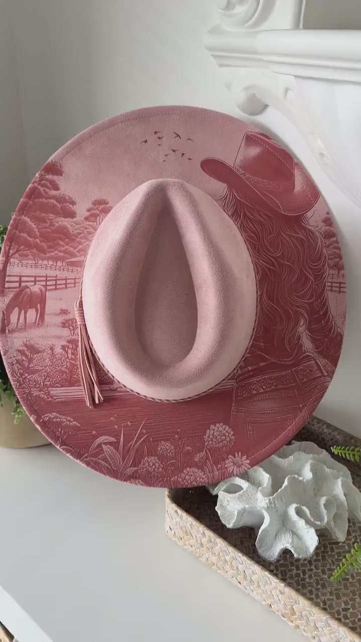 Cowgirl Dreams - Country Engraved Wide Brim Hat, Vegan Suede Fedora Hat, Laser Engraved, Cowboy Hat, Burned Fedora, Cowgirl Design