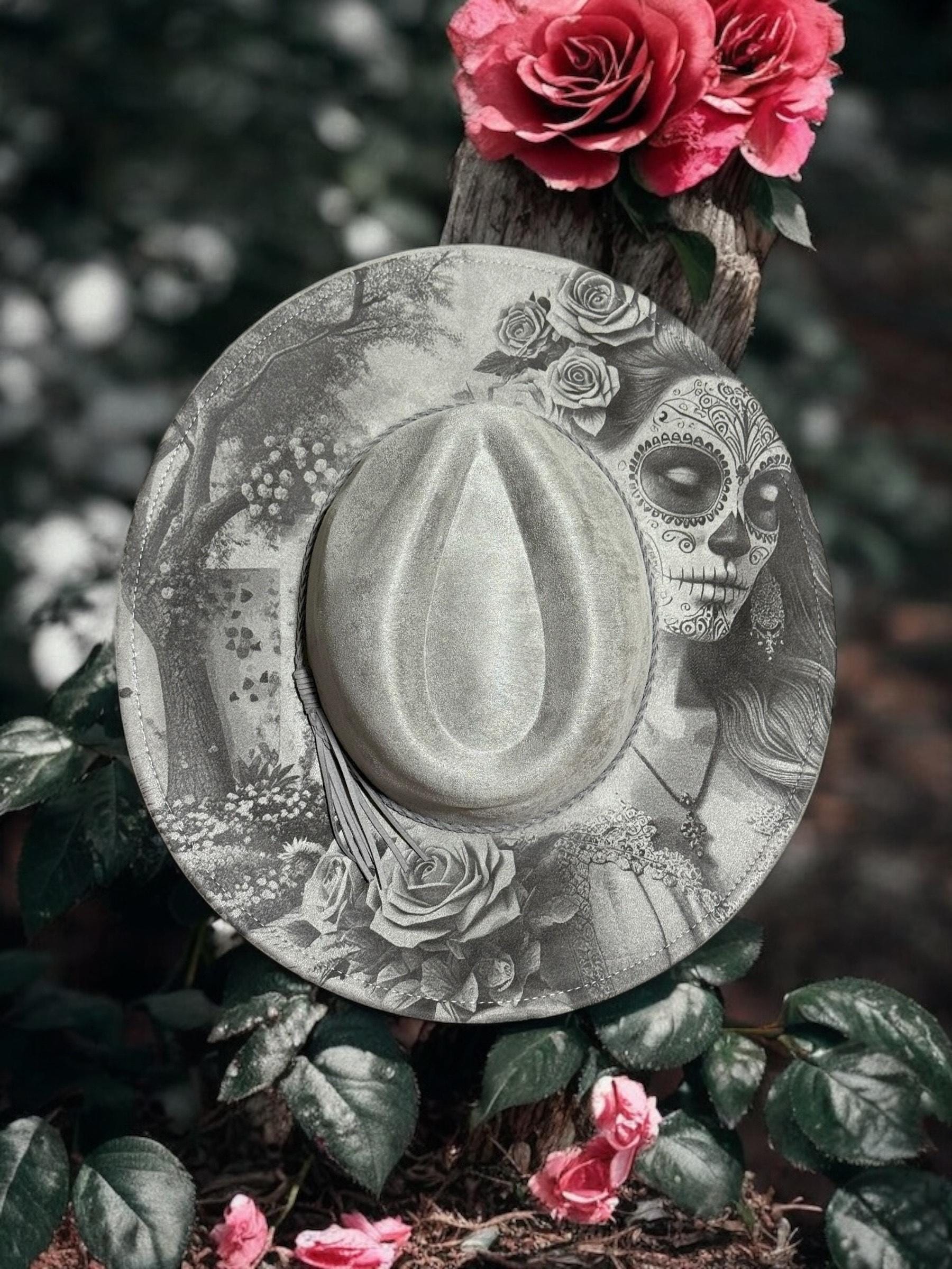 Eternal Bloom Engraved Hat – Sugar Skull & Floral Boho Design, Hand-Burned Brim, Western Boho Hat, Unique Festival Fashion