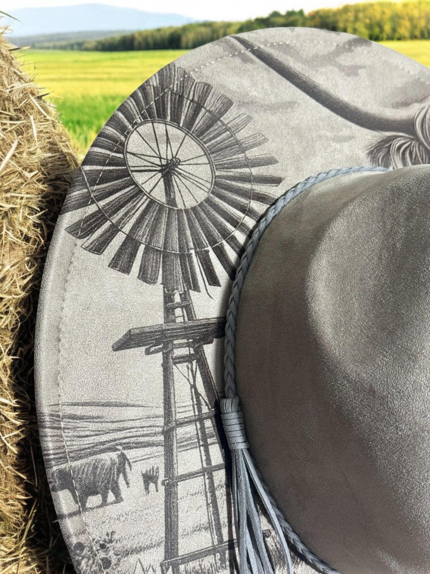 Highland Cow Laser Engraved Hat – Rustic Western Brim with Sunflowers & Windmill | Country Rodeo Cowboy Cowgirl Fedora