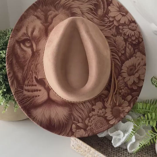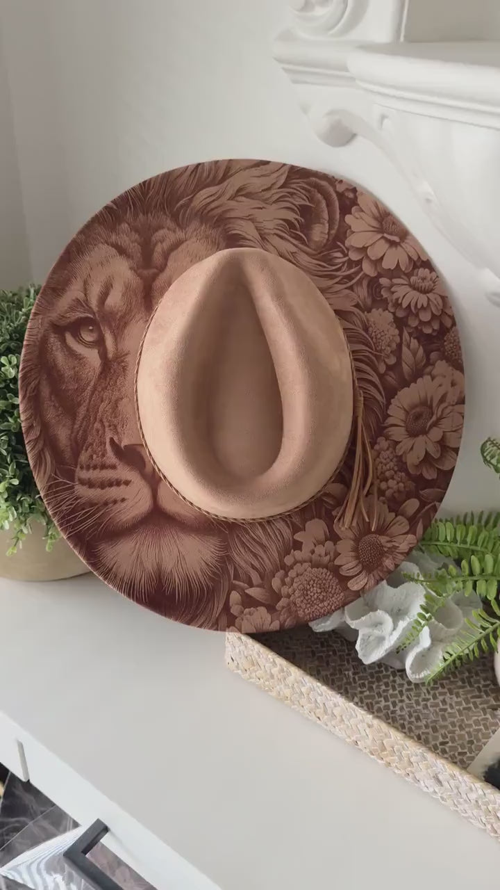 Lion & Blooms - Engraved Lion and Floral Wide Brim Hat, Vegan Suede Fedora Hat, Laser Engraved, Cowboy Hat, Burned Fedora