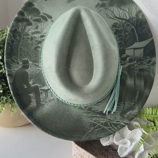 The Bushman’s Retreat - Engraved Fishing Camping Scene Wide Brim Hat, Vegan Suede Fedora Hat, Laser Engraved, Cowboy Hat, Burned Fedora