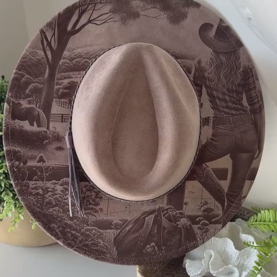 Wanderers View - Laser Engraved Cow Girl Hat with Horse Scene, Wide Brim Hat, Vegan Suede Fedora Hat, Laser Engraved, Burned Fedora